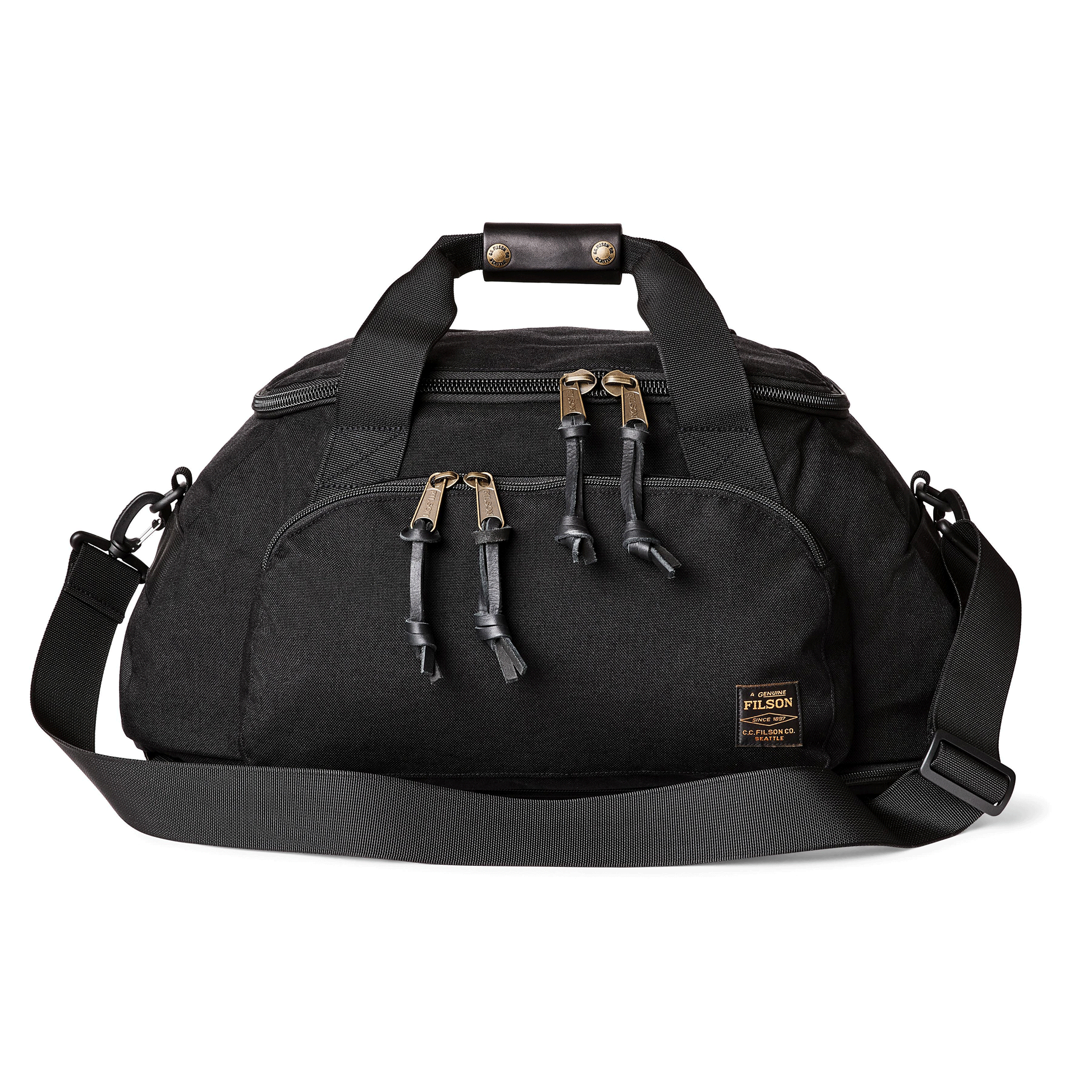 This all-purpose bag combines versatile utility and exceptional durability. The lightweight 1000-denier nylon fabric is woven with the same basketweave pattern as ballistic nylon. The U-shaped top zipper provides easy access to gear. A zippered exterior pocket with internal security pocket keeps essentials close at hand. A second exterior zipper accesses a bag that expands into the main compartment to keep wet or dirty gear separated from the rest of your load. Padded backpack straps can be stowed into the bottom sleeve to avoid snagging on other gear or in luggage compartments. The handles and detachable shoulder strap are made from strong, wide nylon webbing. Bridle Leather carry grip. Padded pocket for a laptop up to 16".