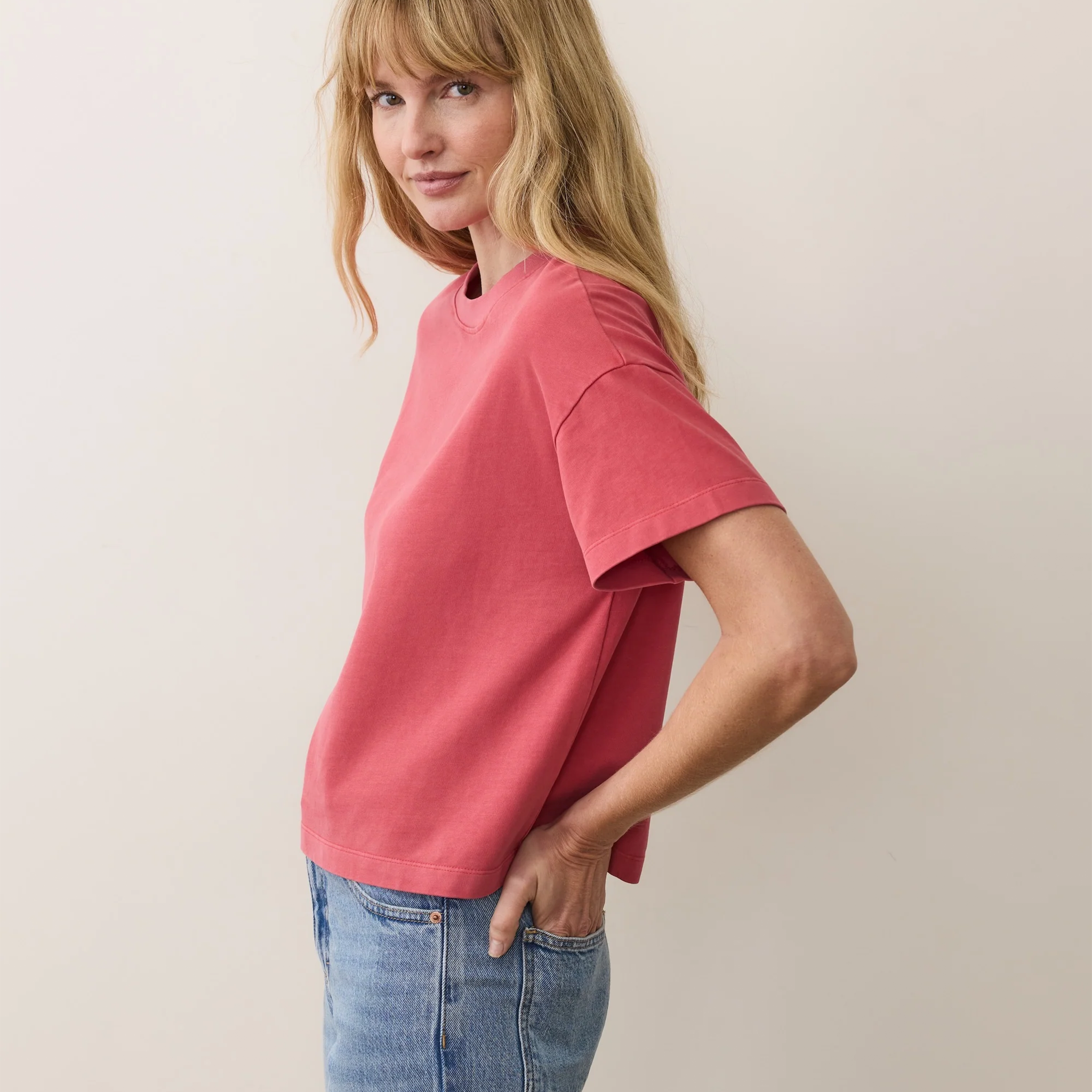 Meet our newest wildly soft tee fabric: a 250 GSM jersey knit that’s brushed for a softer handfeel, and garment dyed for a perfectly broken-in look.